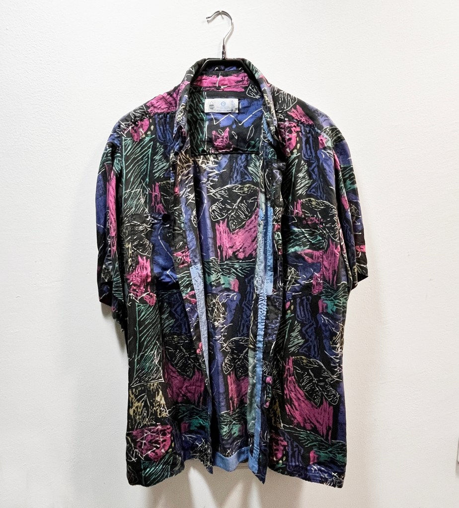 Born in a studio filled with cigarette haze and synth-pop, sometime between the late ’80s and early ’90s, a silken shirt emerged, printed in the colours of neon jungle. Its designer, a dreamer with shoulder pads and big dreams, whispered over it: “You’re made for adventures.”